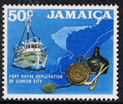 Built expressly for submarine archaeologi¬cal research, she is shown exploring the sunken city of Port Royal (07-06-1692 during an earthquake), Jamaica, where she spent 10 weeks in 1959. Specialized equipment includes bow nozzles for water¬jet steering, air compressor for divers' air supply and 10" suction hose, heavy-duty cranes, built-in glass plates in the bow, diving compartment opening into the sea in the stern, and an 18' water-jet-propelled launch for exploration in shallow water. The watch depicted on the stamp recovered during the exploration was made by Paul Blondel in Amsterdam in 1686 and stopped working on 11h43.