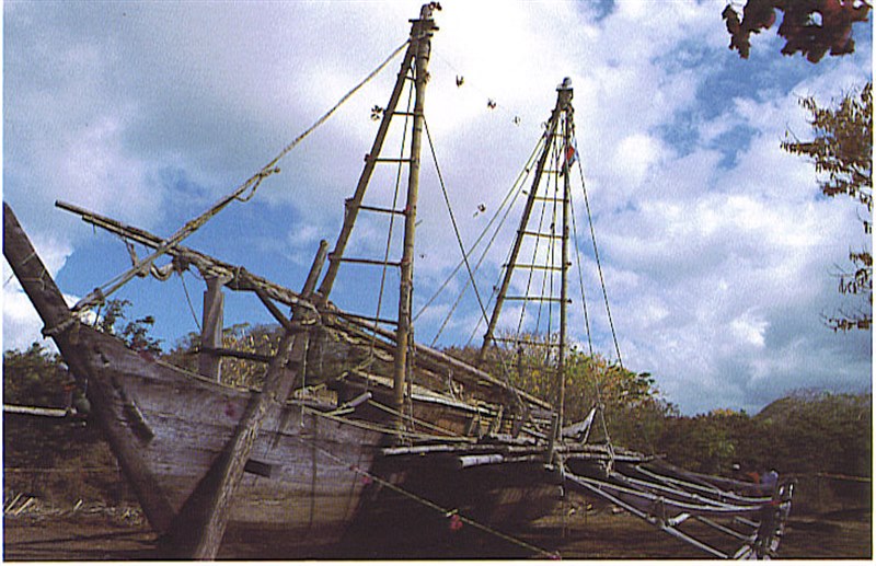 People of southeastern origin settled in Madagascar and the Comoro Islands in the second half of the first millennium CE; the language of Madagascar today is Malagasy of an Austronesian family with strong ties to Ma’anyan and the Borito languages of Borneo. How they reached Madagascar is interesting and something which has intrigued a number of scholars. One voyage, undertaken by Bob Hobman and his crew on 6 August 1985, proved that Neolithic navigators could have crossed over from Indonesia to Madagascar on an outrigger canoe, the SARIMANOK, a hollowed-out trunk of a huge ghio tree with sails woven from plant fibres. The voyage lasted 63 days.