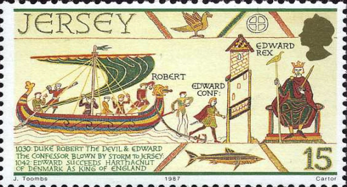 The 15p value depicts the year 1030, when Duke Robert I (the Devil) of Normandy, father of William the Conqueror, prepared an expedition aimed at driving King Canute out of England and placing Edward the Confessor, his kinsman, on the throne. The invasion fleet was driven down the English Channel by a storm, Robert and Edward’s ship ending up in Jersey where the weather being apparently even worse, they spent some time before returning to mainland Normandy. The illegitimate William succeeded his father Robert as Duke of Normandy on the latter’s death in 1035, while in 1042, on the death of Canute’s son, Edward the Confessor was crowned King of England.
