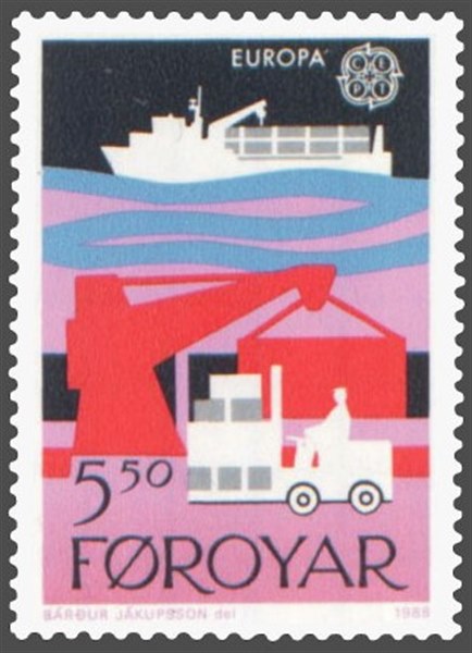 The common motto for the Europe CEPT edition 1988 was transport and communication and the Faroe Islands two stamps one for telecommunication and the other transport, which shows us what looks like a ro-ro vessel with a deck-cargo of containers also fitted out with one crane behind the wheelhouse. She is not identified.