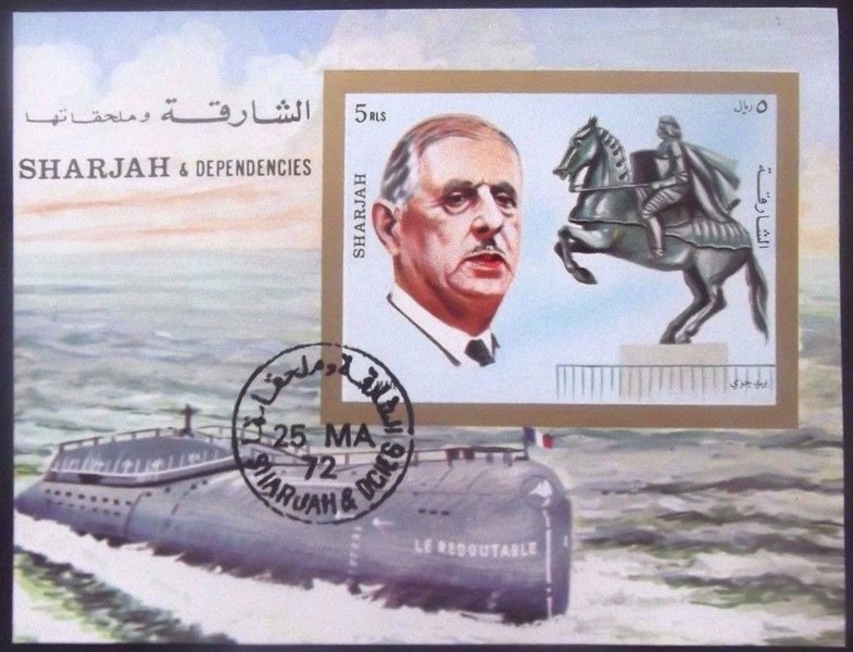The 70c. French stamp shows the nuclear submarine Redoutable, which has a displacement of 7,900 tons on the surface, and 9,000 tons submerged. Length overall is 420 ft., beam 348 ft., draft 32.8 ft. She has one pressurised water-cooled reactor. Main engines consist of two turbo-alternators and one electric motor. Auxiliary propulsion is provided by one diesel. Surface speed 20 knots, submerged, over 25 knots. Missiles: 16 tubes amidships, Polaris type I.C.B.Ms, with a range of 1,900 miles. Four torpedo tubes. Her complement, consisting of two alternating crews, is 135 (14 officers, 121 ratings). She is France's first nuclear-powered submarine, ballistic missile-armed, and her submerged cruise duration is three months. The diesel engine has bunkers for a range of 5,000 miles. The Redoutable was laid down at the Cherbourg Naval Dockyard on March 30, 1964 and was launched March 29, 1969, becoming operational 1970.
