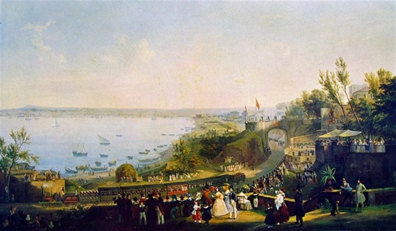 In the foreground is depict the opening of the line by King Ferdinand II of the Two Siciles, the first section from Naples to Portice on 03 October 1839. https://en.wikipedia.org/wiki/Naples%E2 ... ci_railway