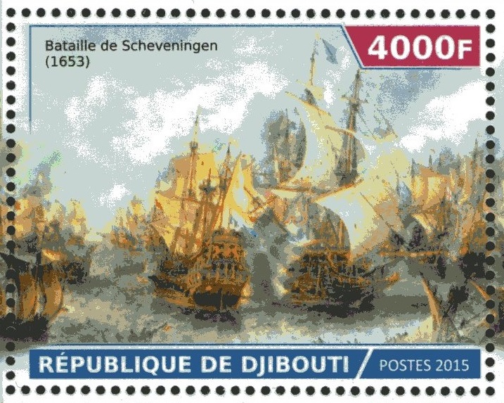 The ship in the centre of the stamp with the Dutch flag flying is the BREDERODE, Tromp’s flagship.