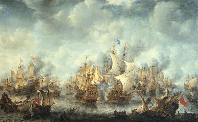 31 July off Scheveningen both fleets met around 06.30 a.m. and the battle commenced. At 11.00 the Dutch suffered a major setback when Admiral Tromp was struck by a stray bullet and mortally wounded.
