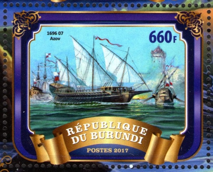 During the preparation of the first Azov campaign in the winter of 1695, the galleys built in the Preobrazhensky (3 cannon galley Principupium and other galleys) in disassembled form were delivered to Voronezh, where they assembled and descended to the water. In 1695 in the Netherlands was ordered 32 rowing galleries, which was intended for walking along the Volga and the Caspian Sea. The gallery was delivered to Russia in parts. Together with her came a master who was supposed to help collect her by model. By this moment, important political events took place. The failed first Azov campaign showed that it is necessary to build a navy to capture Azov. The place of its construction was the village of Preobrazhenskoe. Therefore, the galley arrived from Holland began to be used as a model for the construction of the galleys of the first regular navy of Russia. By February 1696, parts of 26 galleys were built from the raw frozen forest. By April 1696 in Voronezh was built the first regular naval fleet of Russia. In addition to 23 galleys there were 2 ships, 4 fire-ships. May 3, 1696 from Voronezh to Azov went a detachment of 8 galleys at the head of Peter I, who was on the galley "Principium". During this campaign, the king made the first charter of the Russian navy - "Decree on galleys." In this document, he established rules for the transmission of signals sent by the squadron commander, as well as requirements for the captains. The constructed galleys differed little from the galleys of their time. Their length was from 125 to 160 feet, and width - from 18 to-36 feet. On the galleys were two masts - the grotto and the foc. If there was a need, they were removed. Latin sails had two sets - large and small, which were used depending on the strength of the wind. Among 6 four-armed anchors, 2 were located on the nose, 2 at the stern and 2 were spare. The artillery was on the nose and consisted of four 8-pound and one 36-pound guns. The artist's painting depicted on the stamp has the name: "Russian galley during the siege and capture of Azov in the Ottoman Empire (1696)." But the artist was mistaken, since the galleys of Azov were 2 masts. The 3-masted gallery of the Petrine era is the 25-can of the Dvina, built by the Italian ship master Francesco Diponti in the Venetian Manira in St. Petersburg in 1721. Its length was about 48.5 m, the width with the posters was 9.6 m, the oars had a length of 13.2 m and a mass of about 94 kg; Each row paddles six people. The armament of the Dvina consisted of one 24-pounder, two 12-pounder cannons and twelve 3-pound basses. But she did not participate in the siege of Azov.
