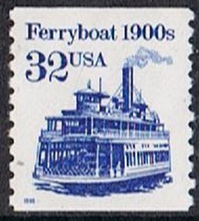 This stamp issued by the USA and designed by Richard Schlecht of Arlington, Virginia is based on ferry boats sailing on the Hudson River by New York around 1900, he used primarily the NEWARK built in 1902 and her sister the CHICAGO built in 1901. The two double ended ferries were sisters but did have minor differences.