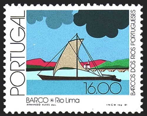 The 16e stamp shows is a small open barca used on the upper Rio Lima in north-western Portugal and used for local fishing and ferrying. Flat bottom, straight raked stem, wide transom. Straight sides, flared towards the stern. Rowed with a single pair of oars.