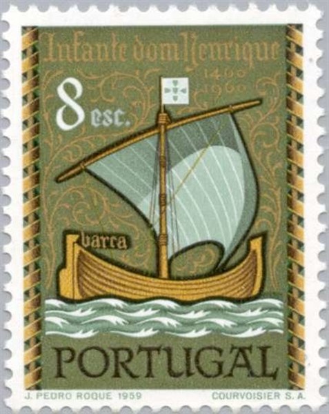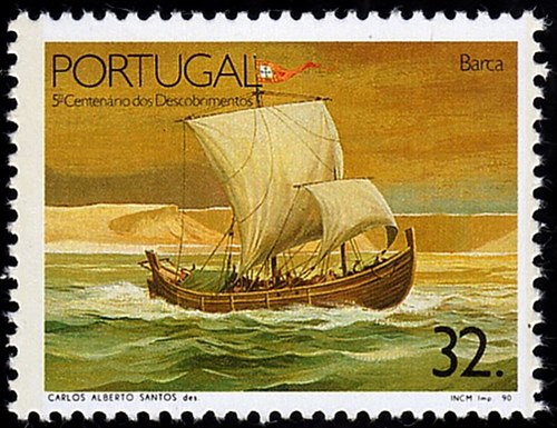 “Barca” used by Portugal during the Portuguese explorer voyages in the 15th century as shown on the 32e stamp was a 2 or 3 masted vessel, often used as a reconnaissance vessel accompanying Portuguese explorers. Small square foresail and a square mainsail as seen on stamp on the two-masted barca’s. She was sometimes rowed.