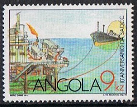 Angola issued in 1990 two stamps for the 10th Anniversary of SADCC, the 9k stamp depict an oil tanker which is loading oil from an oil platform in sea. The drawing of the tanker is stylized.