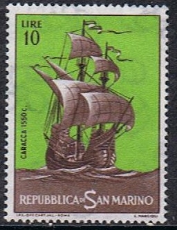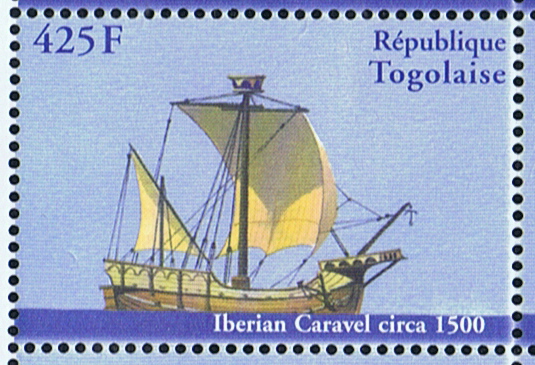 At that time the caravel carried lateen sails on all the masts, while the carrack carried a square sail on the foremast and a lateen sail on the mizzenmast. The carrack was distinguished by her overhanging forecastle as seen on the stamp.