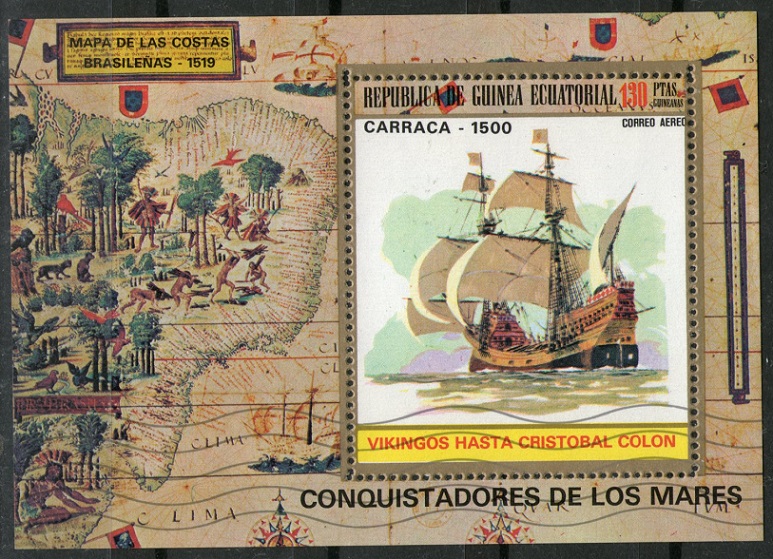 The inscription on this stamp gives that an Iberian Caravel is depicted, but in my opinion, it is a carrack.