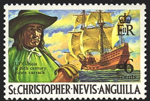 This stamp issued by Gambia in 1980 shows a Spanish carrack; a larger type of trading vessel used around Europe at about the same time as the caravel. It was rigged similarly to the three-masted version of the caravel, although it was larger and more robust. The carrack was the predecessor of the larger three-masted type of ship which survived until the advent of steam. During the 16th and 17th centuries, all Spanish trading voyages to India, China, and America employed carracks. They were eventually superseded by the galleon, first conceived by Sir John Hawkins, a more seaworthy vessel without a high-forward castle.