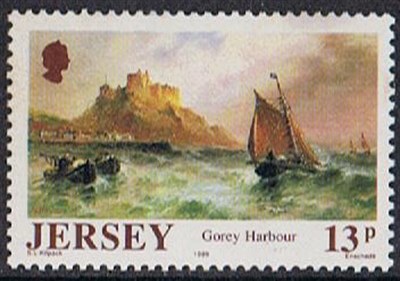 The stamp shows us Gorey Harbour on Jersey with in the background Mont Orgueil Castle, in the foreground a wooden hulled fishing boat under sail and two rowing boats around 1795.