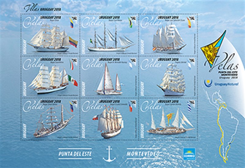 On April 13-2018 Uruguayan Mail has put into circulation a sheet and the philatelic card Velas Uruguay 2018. The issue will be made within the framework of the International Meeting and Sailing Latin America 2018, which will meet between 10 and 15 April in Punta del Este and Montevideo to frigates, brigantines and schooners of Brazil, Chile, Spain, Venezuela, Colombia, Mexico, Argentina and Uruguay.