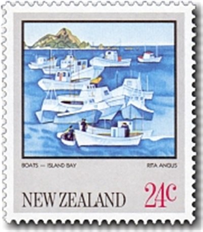 New Zealand issued in 1983 four stamps which shows us paintings made by Rita Angus, one of this stamps has a maritime theme, it shows us the Island Bay near Wellington, https://en.wikipedia.org/wiki/Island_Bay,_New_Zealand with in the bay fishing boats, which are locally known as the Italian wooden fishing boats. Since the late 19th century Italian emigrants settled in Island Bay (little Italy) many commenced fishing from the bay in the Cook Strait After the 1960s the Italian fleet declined and 2018 there are not more Italian boats in the bay.