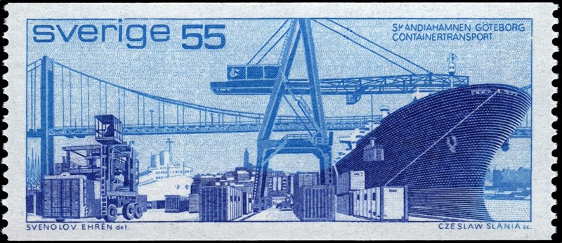The container ship on the Swedish 55 ore stamp is the Atlantic Span, built by Rheinstal Noordseewerke, at Emden, for Rederi A/B Transatlantic, of Gothenhurg. She also carries vehicles and general cargo. The vessel's gross tonnage is 11,955 tons, 16,300 deadweight, 6,224 net; her breadth 86.82 ft.; draft 29 ft. A 9-cylinder Krupp-B. and W. oil engine, 20.700 b.h.p. gives the vessel a speed of 21.75 knots. SG647