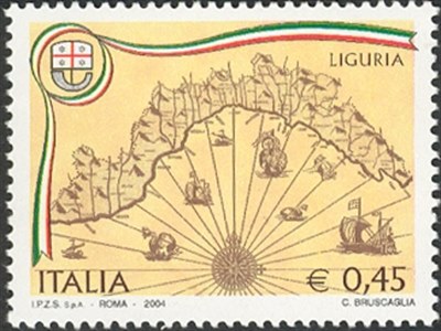 The Italian stamp of the Liguria district is designed after an ancient map showing the boundaries of the region.
