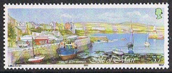 37p Port St Mary, Port St Mary is the principal harbour in the South of the island. It handles coastal vessels, supports a buoyant fishing industry. The stamp shows fishing vessels, cabin cruisers and yachts.