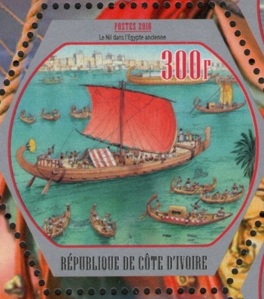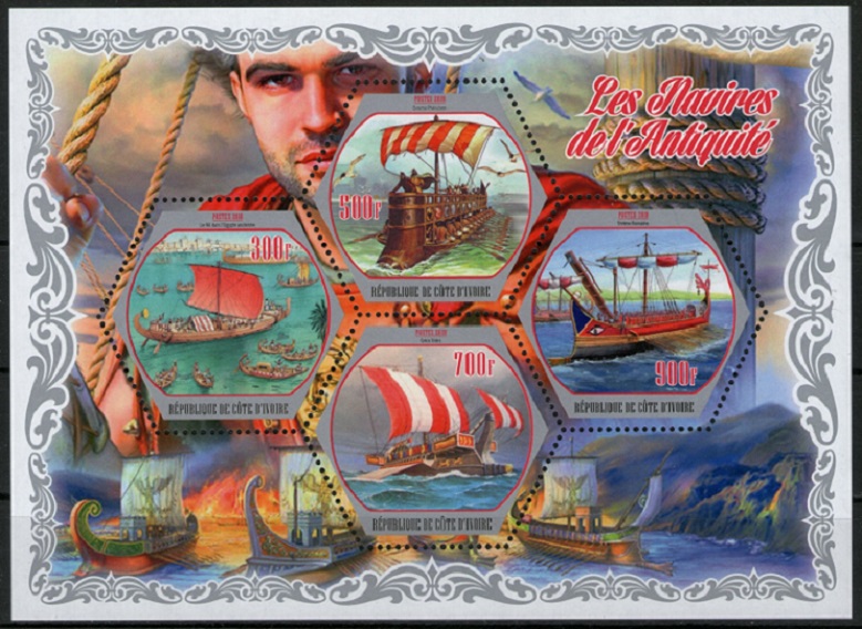 The testimonies of ancient authors, largely illustrated nowadays by archaeological finds and scientific reconstructions, enthrallingly describe the "affairs of bygone days" in the history of the culture of mankind. A clear example of this is the development of shipbuilding and navigation, the construction of ports and lighthouses. In ancient times people settled along the banks of rivers, lakes and seas. The water was convenient by way of communication and trade, and man mastered this path first on boats and then on ships. Great masters-shipbuilders and skillful navigators of antiquity were considered Phoenicians. In the technology of shipbuilding, they adopted much from the Cretans, who, according to the researchers of antiquity, were the first to apply keel and frames, which increased the strength of the hull. It is believed that, thanks in part to these technical improvements, Crete was the first sea power in the Mediterranean. Gradually other nations - the Etruscans, Greeks, Carthaginians and Romans begin to challenge the Phoenicians dominant position in shipbuilding. The desire to increase speed, maneuverability, the impact force of a ram against an enemy ship led to the appearance of ships with two, three, four and five tiers of oars. For several centuries Rome had no rivals at sea. Hundreds of oarsmen with muscular power set in motion biremes, triremes (the Greeks called these ships of the trireme), quintiles and penthers. History knows the ships of the Ancient World and with a large number of tiers of oars. The invention of the sail greatly improved the maneuverability of the ships and allowed covering long distances. However, the first sailing armament initially consisted of a straight rake sail, which could only be used with a favorable wind. The longship was a type of ship that was developed over a period of centuries and perfected by its most famous user, the Vikings, in approximately the 9th century. The ships were clinker-built, utilizing overlapping wooden strakes. On the sheetlet of Gabon depict ancient battle sailing-oared ships:
