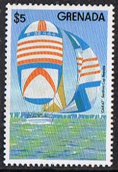 The yacht depict on this stamp is the Frers designed 50 footer CARAT which was built as the RETALIATION, which was skippered by Dennis Conner to overall victory in the 1982 SORC. RETALIATION was another development of Frers' earlier BLIZZARD, but with slightly less fullness in the stern. At that time was the owner of the yacht F. Parker Heineman from Old Saybrook, Conn. USA.