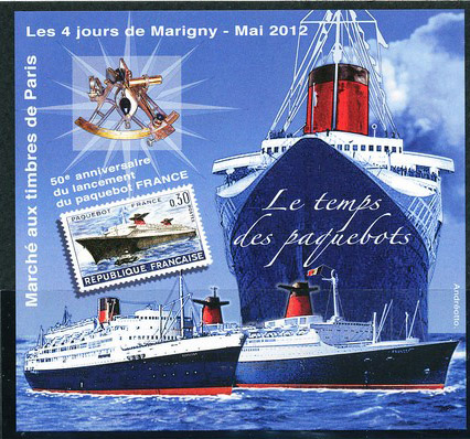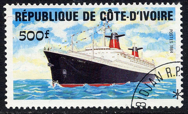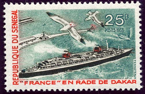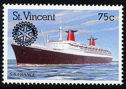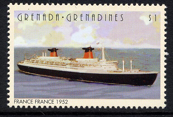 The wings on the funnels are flu ducts for greater efficiency. The France had only 8 boilers whereas the NORMANDIE had 29. The ship also had a salt water distillation plant thus saving the space that would be taken up by 4,600 tons of fresh water. Dimensions length 1,035ft x 110ft beam. 160,000 hp. St Vincent SG 1224. France SG 1557. Senegal SG 344. Grenada Grenadines SG2210.