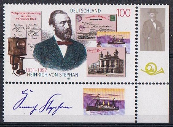 Germany issued in 1997 one stamp for the 100th Anniversary of the dead of Postmaster Heinrich von Stephan (1831-1897).