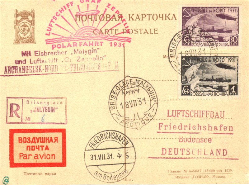 Among the most desirable of polar philatelic items are those from the polar rendezvous of the Graf Zeppelin airship and the Russian ice breaker MALYGIN. The intent had originally been to rendezvous with the submarine NAUTILUS (on a Kiribati stamp of 1993), which was then on a Trans-Polar expedition led by Sir Hubert Wilkens..