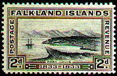 An old print was copied for the design of a 2d. stamp of the Falkland Islands issued in 1933. This shows a brig in Berkeley Sound, off Port Louis. The vessel is probably H.M.S.Clio, under the command of Capt. Onslow, which was despatched in 1833 to the Falklands to reassert British sovereignty over the Islands. Port Louis had been occupied by settlers from the Republic of Buenos Aires. Under the orders of Capt. Onslow, the settlers were compelled to withdraw from the islands and the British flag was again hoisted. The Falklands have been In British occupation ever since, although the Argentine periodically claims pos¬session of them.