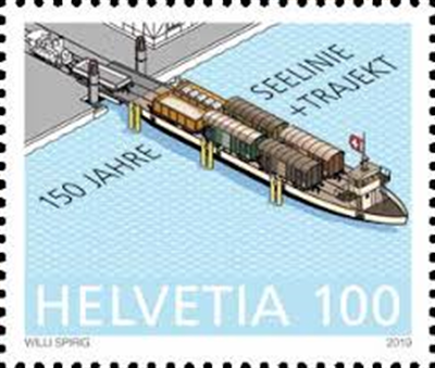 Does the expression “train ferry transport” ring any bells? It means “the loading of railway carriages onto ships”. This form of transport was used on Lake Constance for a long period of time. The railway line along the lake also played an important role in the process. 150 years Lake Line + train ferry is a double anniversary. The first section of the railway line from Romanshorn to Rorschach was opened in 1869, and the train ferries from Romanshorn to Friedrichshafen and Lindau began operating at the same time. This created cross-border connections which were used to transport grain freight wagons in particular. Despite interruptions during the World Wars, the train ferries continued to operate until 1976. This mode of transport was twice as expensive as rail transport over land, but also twice as fast. The Lake Line, meanwhile, is still in use today. It continues to be a vital link for the region and was expanded when the Swiss Federal Railways last changed its timetable. The special stamp worth CHF 1 depicts the train ferry with the railway carriages. The stamp with a face value of CHF 1.50 illustrates the current coexistence between the SBS Schifffahrt ferry company and the Thurbo regional railway.