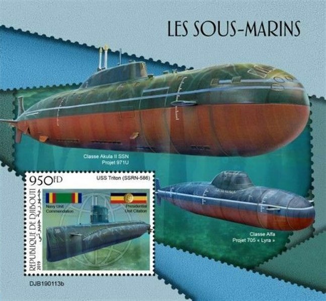 The stamp gives that an Akula-Class SSN Project 971U is depict but by looking at the submarine depict on the stamp you can see that the pod for towing an array sonar on the vertical stern fin is missing. The only in this class without a pod is the Akula-Class (1), otherwise, all the types look the same.