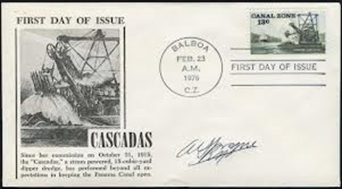In 1976 the Canal Zone Post Office issued a 13c. stamp which depicted the dredger Cascadas at work in the Panama Canal with, in the distance, an unidentified passenger liner. The stamp is copied from a painting by a local artist, Mr. Aiwyn Sprague, according to the Canal Zone Philatelic Agency.