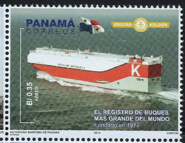 The vehicles carrier depict on this stamp is I believe the DRIVE GREEN HIGHWAY she is the only of her nine class vehicles carrier I can find with the slogan on her side of “Drive Green”.