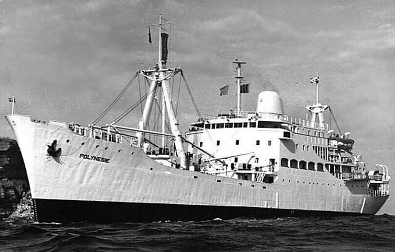 Built at the Dubigeon shipyards in Nantes, POLYNÉSIE was a small passenger-cargo liner with a length of 104.5 m and a beam of 15 m, fitted with a 6-cylinder two-stroke engine; she left Marseille en route for Noumea on 13 June 1954. Averaging a speed of 15 knots, POLYNÉSIE had a freight capacity of 4,165 m3 and cabin accommodation for 36 passengers. She sailed the regular 21-day route between Sydney, Noumea and Port Vila.