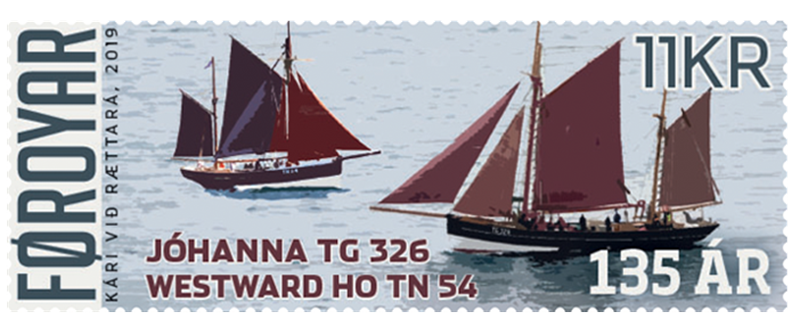 The two smacks featured on the stamp are JÓHANNA TG 326 on the left, and WESTWARD HO TN 54. Both of these smacks are celebrating their 135 anniversaries this year.