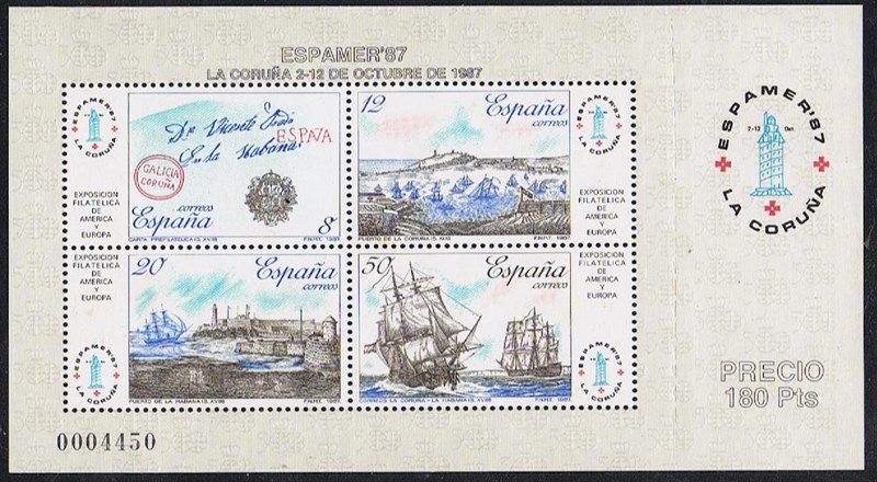In 1987 Spain issued four stamps in a miniature sheet to celebrate ESPAMER “87” held at La Coruna on 02-12 October 1987. The stamps who have a face value of 90 pesetas, but the sheet sold for180 pesetas.