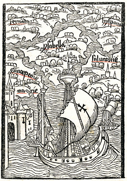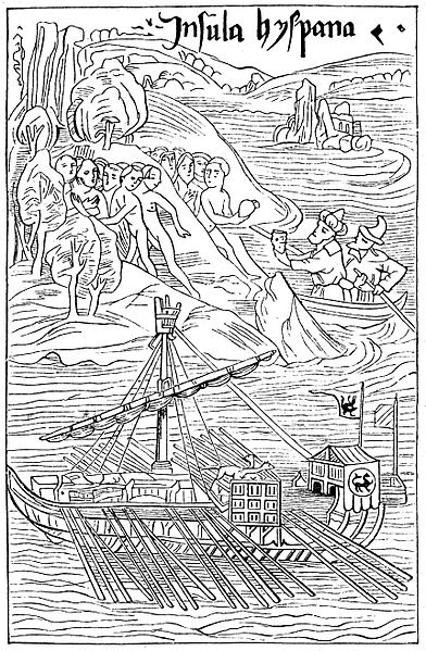 2) Columbus lands in Hispaniola, some natives flee, others trade. Woodcut from 1494 Basel edition of Columbus's letter. Notice the depiction of the oar-driven galley in the foreground – an early European interpretation of the Indian canoe, as per Columbus's description.