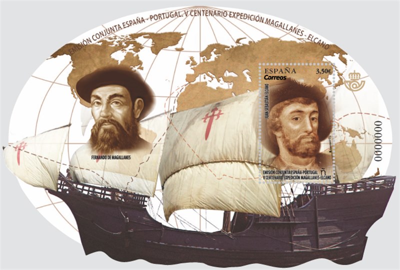The mini sheet issued by Correos, with stamps die-cut on a globe of the world printed on parchment paper, shows the silhouette of a ship, representing the ships that first set out on the expedition: TRINIDAD, SAN ANTONIO, CONCEPCION, SANTIAGO and VICTORIA - the last of these was the only one to complete the journey. (Most probably she is depicted on the miniature sheet.)