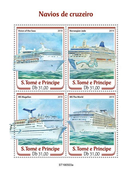 S Tome e Principe issued four stamps and one miniature sheet with cruise vessels.