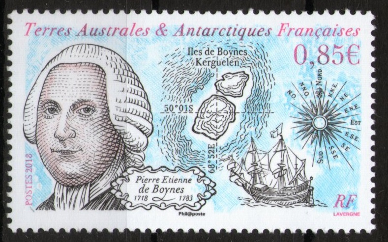 Description of the stamp (size 32 x 52 mm): on the left, the portrait of the Marquis Pierre-Etienne Bourgeosi de Boynes with his date of birth and death; in the center two of the four Boynes islands (the two largest, of which one measures 200 m x 150 m and has a height of 35 m), the two islands are separated by a sea arm of just 15 meters. Their geographical position is: 50 ° 01 ′ S - 68 ° 52 E. Below right, one of the sailing ships of the expedition of Yves Joseph de Kerguelen de Trémarec. Finally, on the far right, a magnificent Wind Rose.