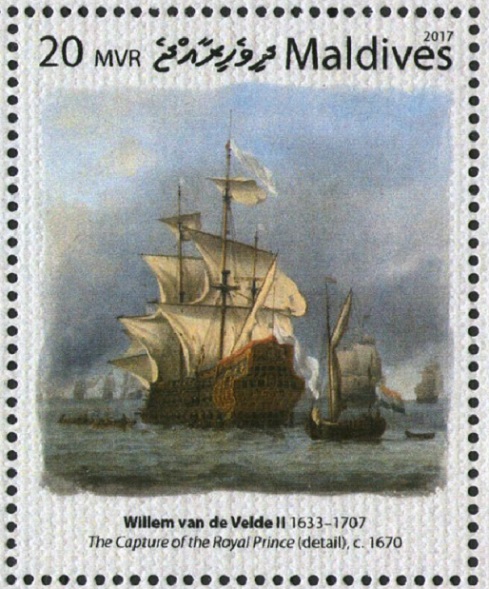 Royal Prince 1610. The design stamp is made after painting of Willem van de Velde «The Capture of the Royal Prince »(detail)1670.
