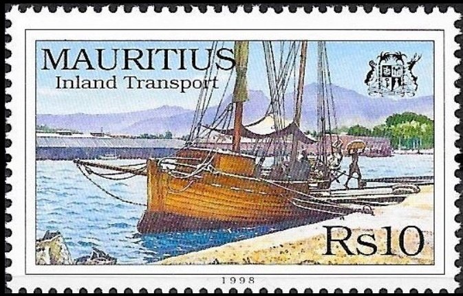 Less known to the public, wooden-hulled sailing barges were used until 1950 for the transport of sugar from factories to Port-Louis but disappeared because, with the advent of diesel lorries, they became too expensive. A Rs.10 stamp, issued in 1998, commemorates this activity, with a stamp showing a coastal barge unloading sugar at the Coaster’s Wharf in Port-Louis in the 1940s.