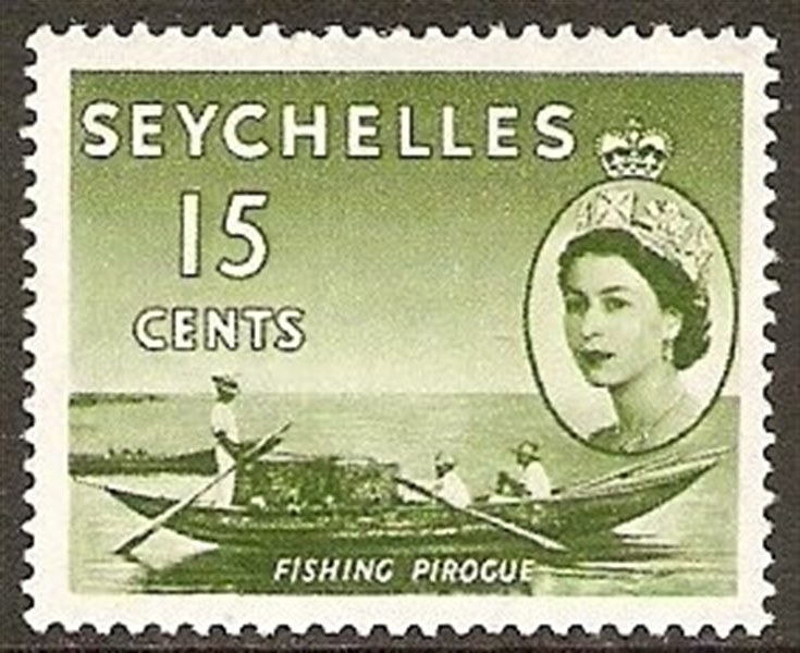 The pirogue of Seychelles, shown on many early stamps of this island group is used for lobster fishing it has a few lobster pots on board. The lobster stock fishing on Seychelles dwindle nowadays and catching lobster is only allowed every second year for 1 month.