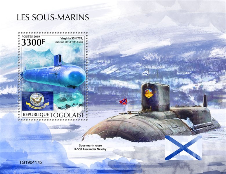 Togo issued in 2019 a set of stamps and a miniature sheet with submarines.