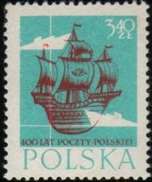 For the 400th anniversary of the Polish Postage, Poland issued in 1958 a set of stamps of which one stamp shows us a medieval ship and two silhouettes of modern ships.