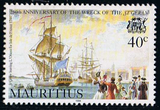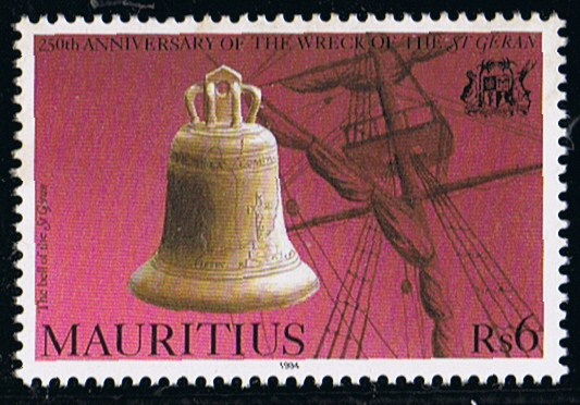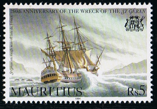 Mauritius 1976 60c sg504, scott422. 1994 40c/5r , 15r sg907/09 sgMS911, scott790/792 794 (the 709 depict the ships bell and a mast of the ST GERAN)