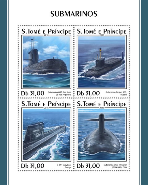 Sao Tome et Principe issued in 2018 a set of stamps and a miniature sheet with submarines.