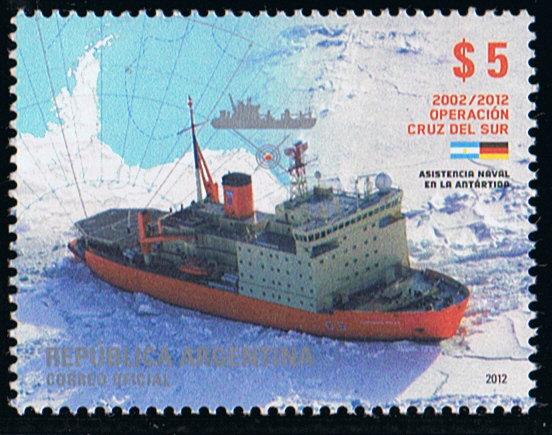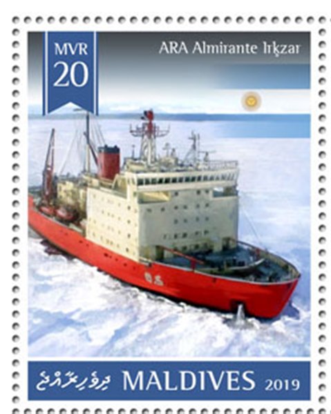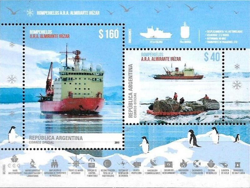 Two miniature sheets were issued in 2019 by Argentina of which one shows us the icebreaker ALMIRANTE IRÍZAR which after a long repair period was back in service. The $40 stamp shows her also and in the foreground two RIB craft transporting stores from the ship to a base in Antarctica. The Argentina post gives by this issues: