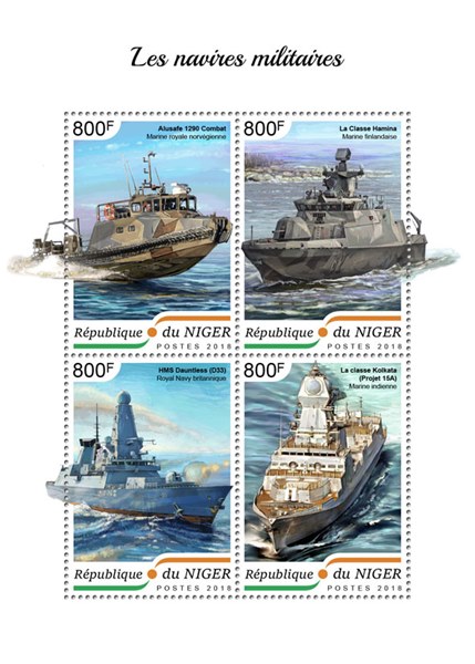 Niger issued in 2018 four stamps and a miniature sheet with modern warships.