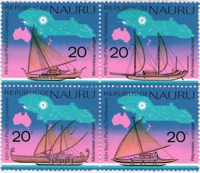 Nauru issued in 1975 four stamps for the 15th conference of the South Pacific Commission, which shows us outriggers used in the Pacific.