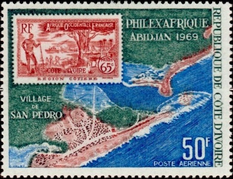 This stamp was issued for the opening of the Philexafrique in Abidjan, Ivory Coast shows us a view of San Pedro in the Ivory Coast in 1969 and a stamp of 1936 sg 132 which shows us a three funnel liner alongside which not has been identified.